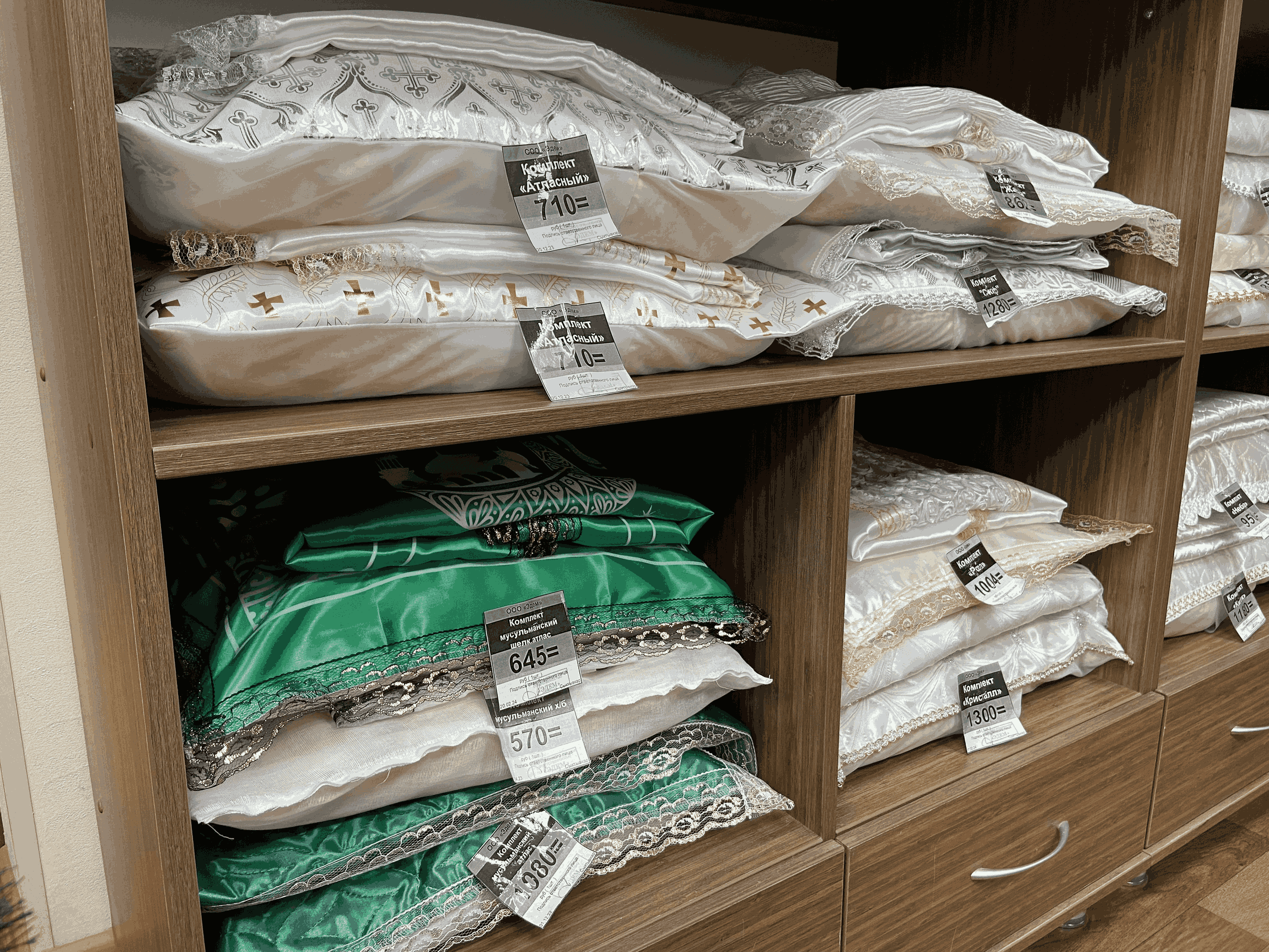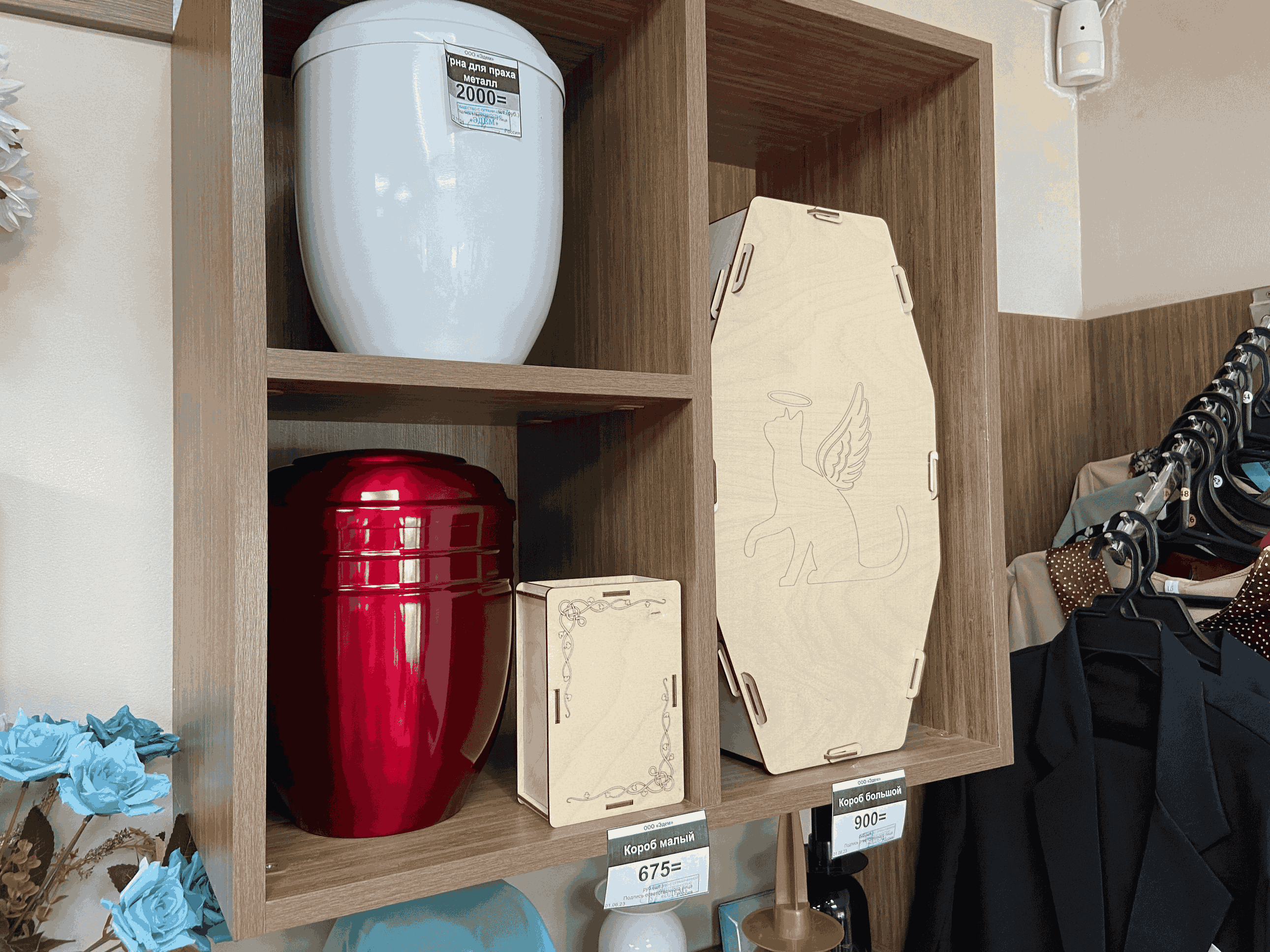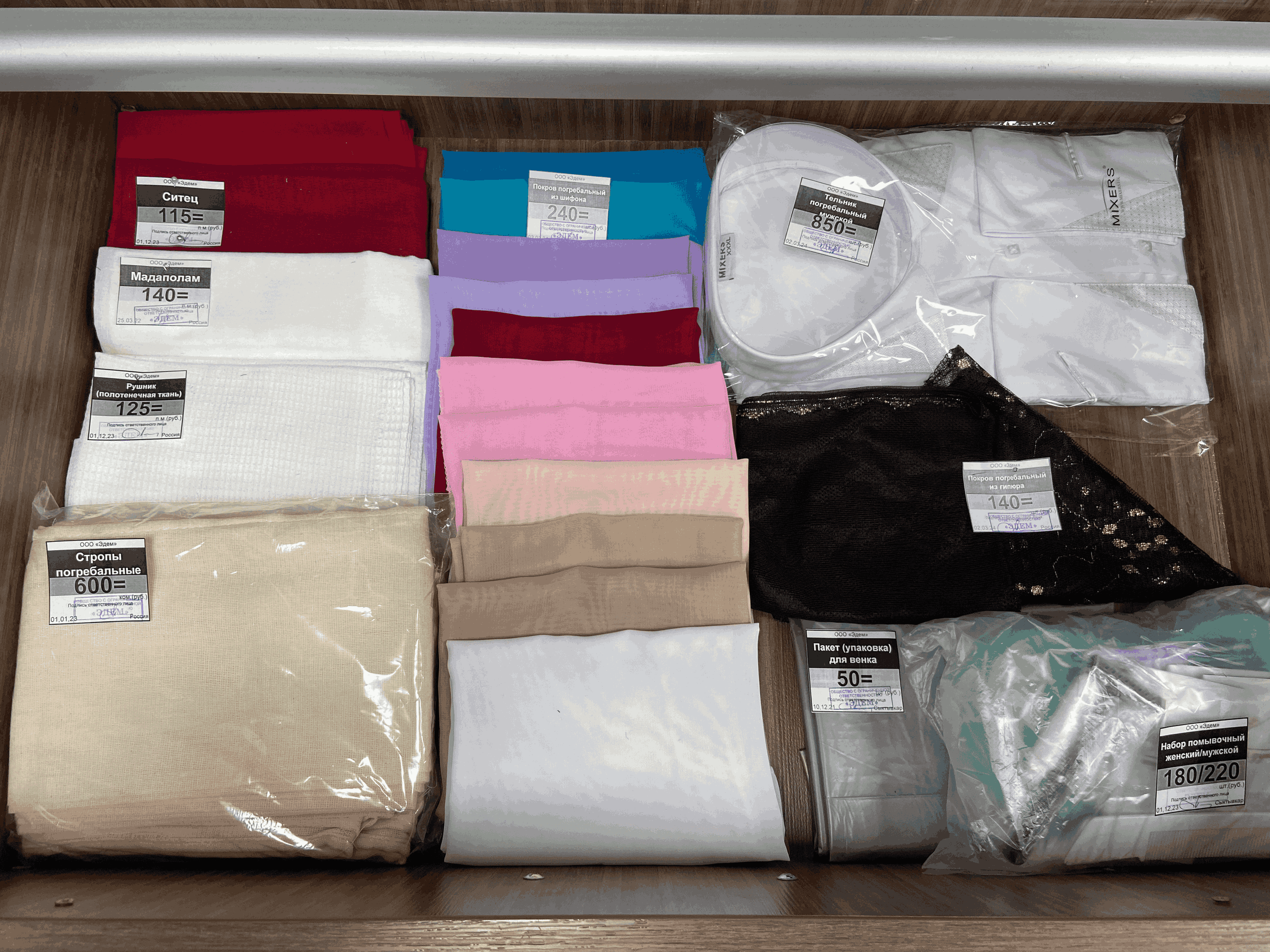 В нашем магазине вы найдете все необходимое для проведения похоронных церемоний. У нас представлен широкий ассортимент товаров, включающий около 400 наименований. Наш коллектив постоянно совершенствует и внедряет новые подходы к предоставлению услуг и расширению ассортимента похоронных принадлежностей. Мы всегда стремимся выполнять свою работу добросовестно, предлагая нашим клиентам самый широкий выбор товаров и лучший сервис в городе Сыктывкаре. Ритуальные аксессуары (включая свечи, иконки, нательные крестики, погребальные украшения и погребальные венчики) мы закупаем у Художественно-производственного предприятия “Софрино” Русской православной церкви. Наша продукция отличается высоким качеством и эстетикой. В ассортименте есть комплекты для гроба (подушка + покрывало), фоторамки, искусственные цветы; траурная лента, рюши, тесьма для обивки гроба; изделия из фольги для крышки гроба; металлические аксессуары (вазы, кресты, звезды) для памятников; различные ткани (от ситец до бархата), рюши (от атласа до каплона) для обивки гробов; нательные крестики, погребальные крестики и венчики, иконки; подставочницы для свечей; ритуальный рушник; стропы; траурный шарф или бандана; набор помывочных принадлежностей (мужской или женский); мужские рубашки; женскую обувь (туфли или тапочки); мужское и женское белье; носочки, чулочные изделия или колготки; ожерелья-подбивку. Набор “Элегия” включает в себя подушку и одеяло для гроба, свечи и специальную одежду для умерших: мужской костюм (от 46 до 62 размера) и женское платье (от 48 до 60 размера).